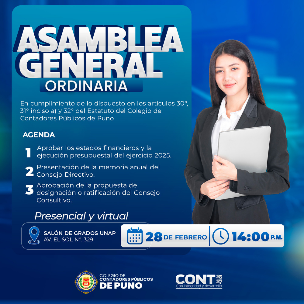 En cumplimiento de lo dispuesto en el Estatuto Institucional, el Colegio de Contadores Pรบblicos de Puno convoca a sus miembros a participar en la Asamblea General Ordinaria 2026.