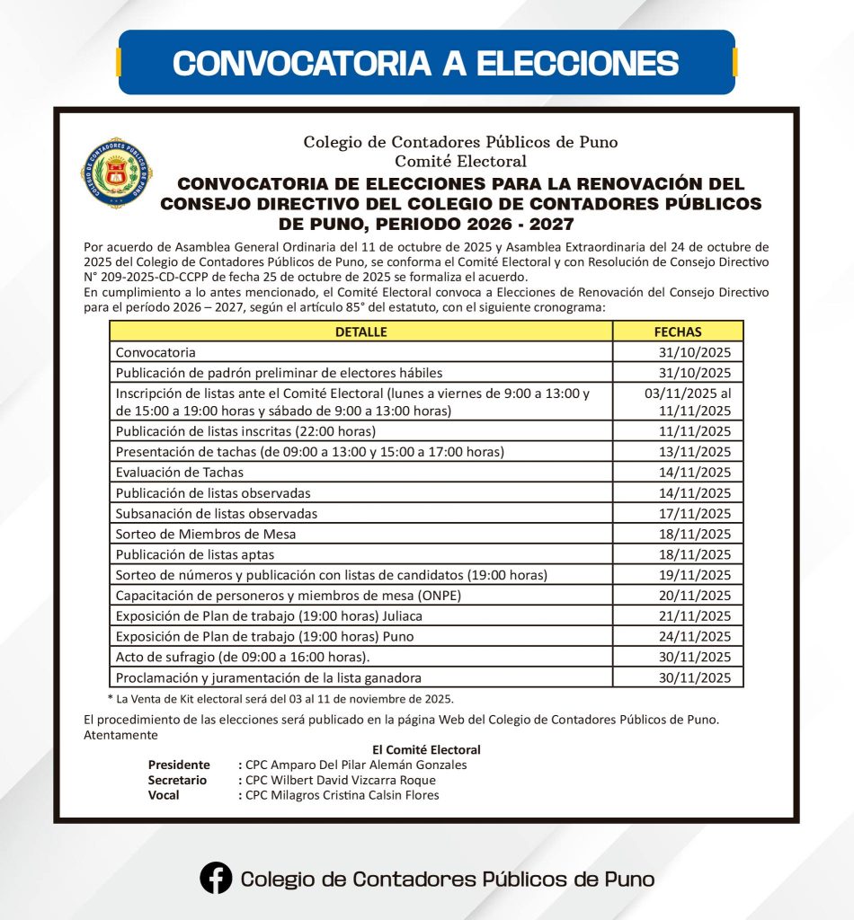 El Colegio de Contadores Públicos de Puno, a través del Comité Electoral, convoca al proceso de Elecciones para la renovación del Consejo Directivo, periodo 2026–2027, conforme al cronograma establecido y en cumplimiento del Estatuto Institucional.