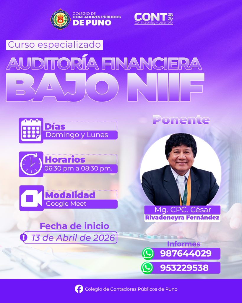 El Colegio de Contadores Públicos de Puno invita a sus agremiados, profesionales y público interesado a participar en el Curso Especializado: Auditoría Financiera bajo NIIF, un espacio académico orientado a fortalecer conocimientos en la aplicación de las Normas Internacionales de Información Financiera.